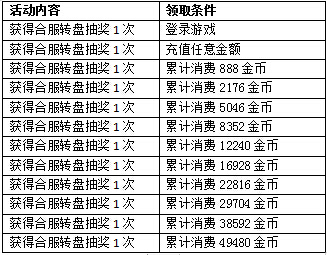 【活动内容】:活动期间,玩家可进行抽奖,登录游戏即可获得1次抽奖次数,充值任意金额即可获得1次抽奖次数,之后每次消费一定数量金币均可获得1次抽奖次数,12次抽奖后可领走全部奖励。