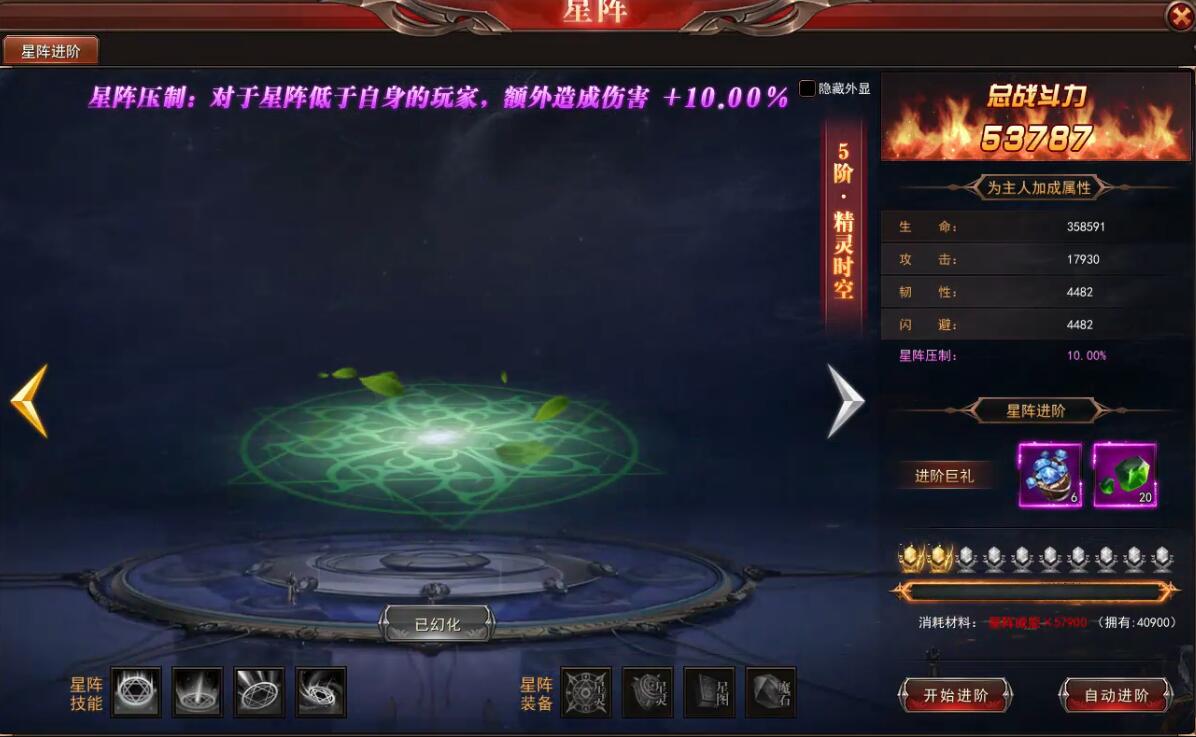 星阵技能:星阵升级到一定等阶即可开启星阵技能,星阵技能一个有四个,星阵每到一定等阶就会激活一个星阵技能,每个技能都可以为玩家打来大量的战力加成。