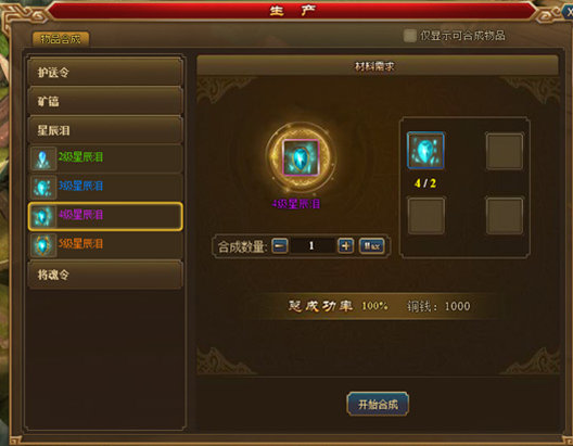 生产可以把低等级物品合成高等级物品。 开启条件: 角色等级≥31 打开生产,在这里,可以对护送令、矿镐、星辰泪、将魂令四种物品进行合成,两个低级护送令合成一个中级护送令,两个中级护送令合成一个高级护送令……以此类推,矿镐、星辰泪以及将魂令也一样,每次合成需要消耗1000银币。