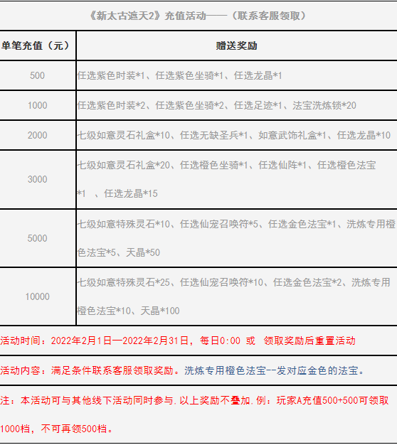 《新太古遮天2》2月限时充值活动