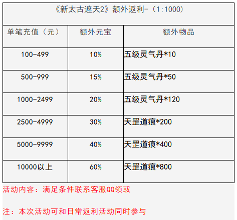 1、 活动期间内单笔充值大于:500元的大侠都能额外获得50w元宝+攻击龙晶*1(活动期间每个账号仅限一次,联系客服领取)