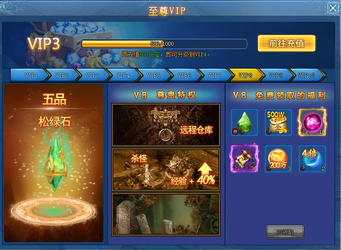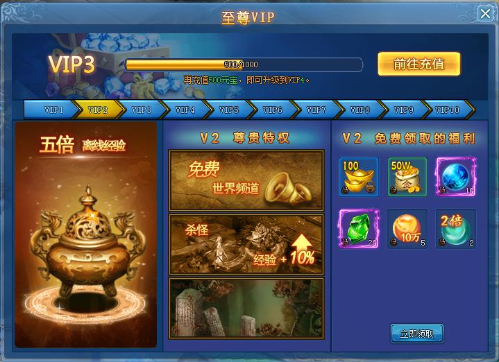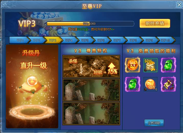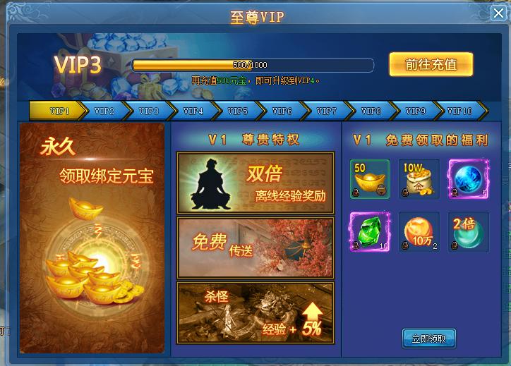 2、游戏内充值10元宝、200元宝、500元宝、1000元宝、2000元宝、5000元宝、10000元宝、20000元宝、30000元宝、50000元宝分别对应激活VIP1-VIP10。