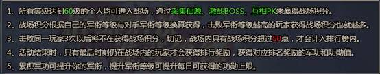 战场每天分时段开启,单场持续时间为15分钟,邻近三个服的玩家可进入同一战场进行PVP。