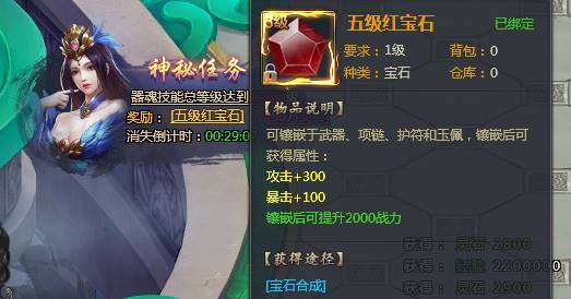 完成首充之后赠送的海量灵石可以直接拿来升级技能,完成神秘任务,获得一颗珍贵的五级宝石。