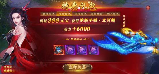 花费388元宝可获得绝版“北冥鲲”坐骑皮肤一个,超级炫酷。