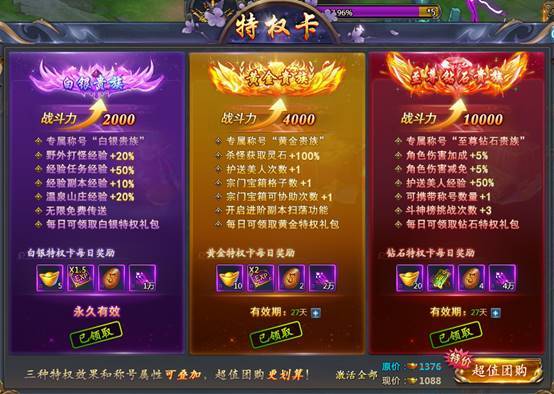 白银贵族首充任意金额赠送,黄金贵族以及至尊钻石贵族建议团购更划算哟,而且各种特权十分实用,每天能领取额外道具福利。