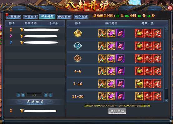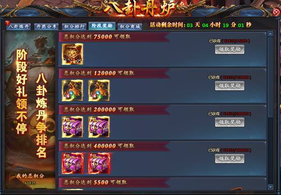 活动在开服第二天开启,玩家通过消耗元宝炼制丹药可获得炼药积分,分享给全服玩家被玩家领取之后可获得额外积分。