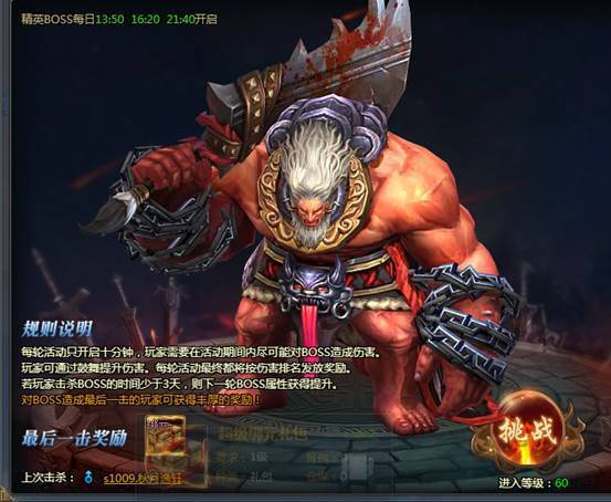 每天的13:50、16:20、21:40三个时间段《山河图志》会开启精英BOSS活动,每轮活动只开启10分钟,玩家需要在活动时间内尽可能对boss造成伤害,玩家可以通过鼓舞提升伤害。每轮活动最终都将按伤害排名发放奖励。若玩家击杀boss的时间少于3天,则下一轮boss属性将会活动提升,对boss造成最后一击的玩家可获得丰厚奖励,有机会开出500-5000绑定元宝啊!BOSS如果在当前开启时间段内没有被击杀将会在下个时间段以剩余血量继续出现。