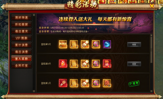 活动期间玩家每日登陆即可领取大量奖励,更有稀有资质丹礼包、国庆称号、上古秘钥拱手相送!