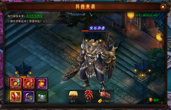 活动期间,玩家通过点击异兽来袭按钮参与活动,一共会刷新3只异兽,每一只都携带着海量极品材料,玩家可以通过精彩活动获取鞭炮驱赶异兽,还在等什么?快来吧!