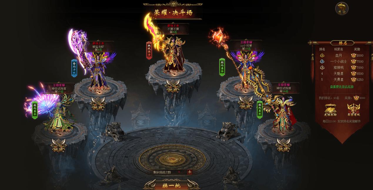 玩家可通过决斗场挑战试炼官或者其他玩家,更新自己的决斗场排名。挑战后可获得大量武勋奖励,连续胜利还可领取连胜奖励。每日系统还会根据玩家的昨日的决斗排名,发放荣誉奖励邮件。