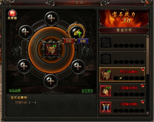 开启等级: 玩家等级达到90级,即可开启宝石系统。 功能效果: 1.每件装备可以镶嵌6种宝石,宝石种类不能重复,且只有穿戴装备的时候才能镶嵌。 2.未穿戴装备时镶嵌的宝石属性不会生效。 3.随着玩家转生的等级越高,开启的宝石的孔数越多。 4.消耗低级的同类型宝石可以合成高级的宝石。 5.当宝石总等级达到一定数值后,可以获得额外属性加成。